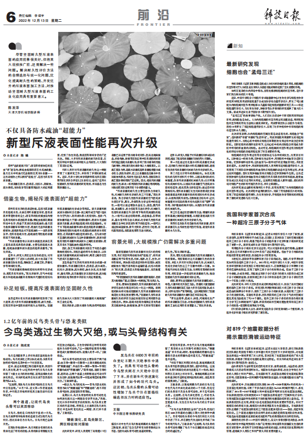 12月13日,科技日报第6版刊发《不仅具备防水疏油“超能力” 新型斥液表面性能再次升级》。近日,天津大学机械学院讲师陈发泽在国际期刊《化学学会评论》上发表综述,总结了近年来坚固耐久型斥液表面的研究现状,并被遴选为当期封面论文。