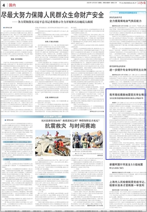 本报讯(记者 姜凝)12月18日23时59分在甘肃临夏州积石山县发生6.2级地震并波及邻省青海,12月19日9时46分在新疆克孜勒苏州阿图什市发生5.5级地震。突发灾情牵动人心。昨天记者从南开大学、天津大学、天津师范大学、天津财经大学等多所高校了解到,学校快速启动受灾学生摸查工作,为有需要的同学提供临时困难补助,必要时给予心理辅导。