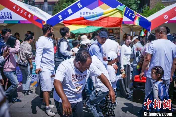 5月10日,天津,来自非洲留学生与参观者跳舞互动。当日,以“上合之约 津彩国际”为主题的天津市外国留学生文艺展演暨天津大学第十五届国际文化节举办。来自全球近50个国家的千余名在津留学生欢聚天津大学,通过歌舞展演、国家展台展览、风味小吃制作与品尝等形式,向参观者展示各国的人文风情。中新社记者 佟郁 摄