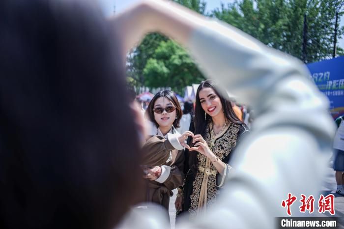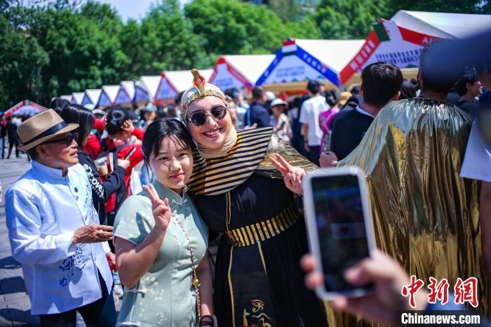 5月10日,天津,埃及留学生与参观者互动合影。当日,以“上合之约 津彩国际”为主题的天津市外国留学生文艺展演暨天津大学第十五届国际文化节举办。来自全球近50个国家的千余名在津留学生欢聚天津大学,通过歌舞展演、国家展台展览、风味小吃制作与品尝等形式,向参观者展示各国的人文风情。中新社记者 佟郁 摄
