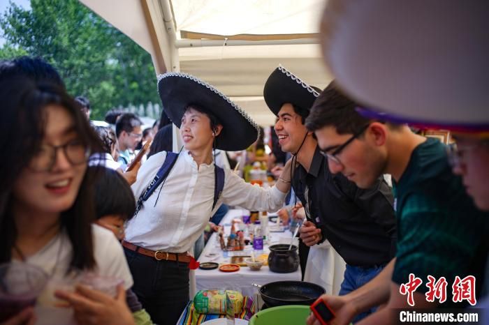 5月10日,天津,参观者在墨西哥展位与留学生互动。当日,以“上合之约 津彩国际”为主题的天津市外国留学生文艺展演暨天津大学第十五届国际文化节举办。来自全球近50个国家的千余名在津留学生欢聚天津大学,通过歌舞展演、国家展台展览、风味小吃制作与品尝等形式,向参观者展示各国的人文风情。中新社记者 佟郁 摄