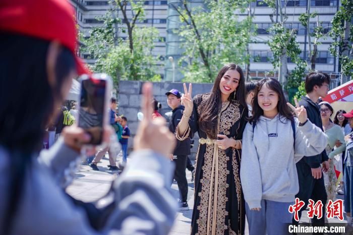 5月10日,天津,来自摩洛哥留学生与参观者互动合影。当日,以“上合之约 津彩国际”为主题的天津市外国留学生文艺展演暨天津大学第十五届国际文化节举办。来自全球近50个国家的千余名在津留学生欢聚天津大学,通过歌舞展演、国家展台展览、风味小吃制作与品尝等形式,向参观者展示各国的人文风情。中新社记者 佟郁 摄