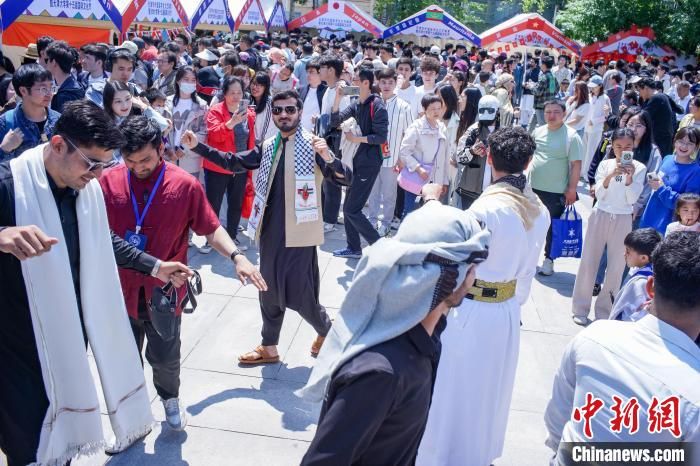 5月10日,天津,来自也门留学生与参观者跳舞互动。当日,以“上合之约 津彩国际”为主题的天津市外国留学生文艺展演暨天津大学第十五届国际文化节举办。来自全球近50个国家的千余名在津留学生欢聚天津大学,通过歌舞展演、国家展台展览、风味小吃制作与品尝等形式,向参观者展示各国的人文风情。中新社记者 佟郁 摄