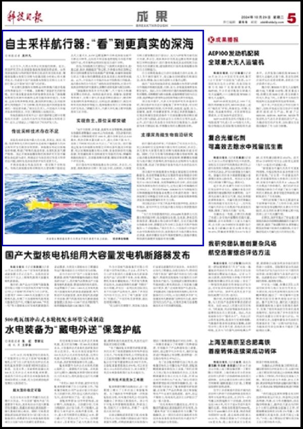 航行器如何实现深海微生物长时间、多点位、大深度、高保真保存采样?刘玉红介绍,长时间、大深度采样主要依靠在航行器设计、优化与研制等方面的技术突破,多点位、高保真保存则是通过微生物多通道原位采样仪器设计、航行器系统集成及运动控制方法等技术的突破实现,进而使得航行器具备深海微生物的自主采样能力。