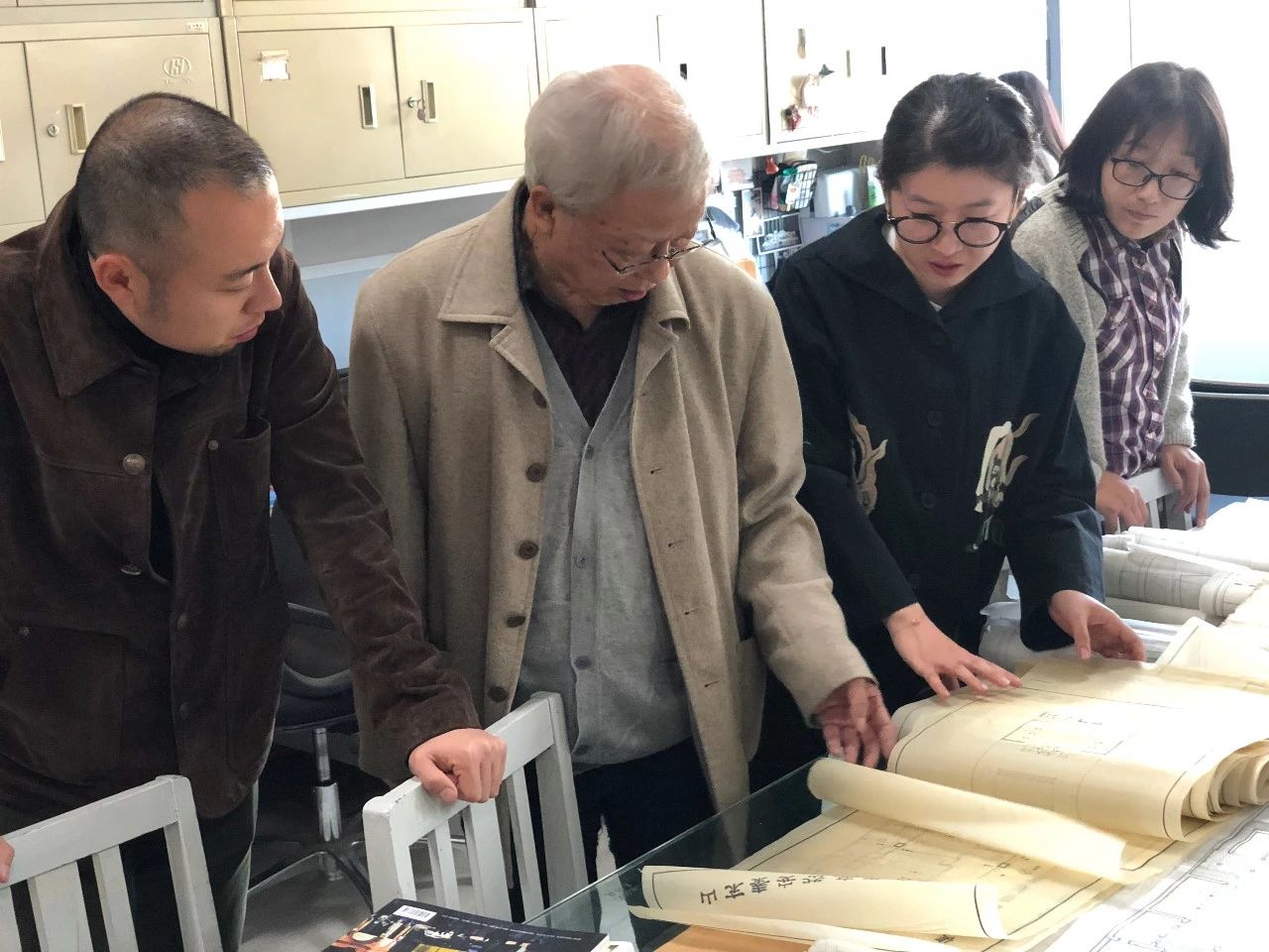 王其亨(左二)翻看学生测绘图纸(图片由天津大学提供)