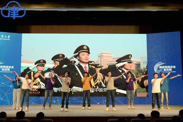 活动现场,同学们也精心创作了丰富多彩的文艺宣传表演。天津美术学院同学们带来了网络安全主题朗诵《你我携手守护清朗》。天津大学学生代表和平山道小学学生代表共同宣读了《网络安全倡议书》。天津外国语大学的同学们用英、日、韩、阿、俄、德、西、法等多种语言翻唱《中国好网民之歌》。现场同学们还表演了天津市首届大学生网络公益歌曲大赛原创主题曲《让世界为我骄傲》。活动最后,天津大学的同学们表演了歌舞《我们都是追梦人》,唱响网安周校园日。