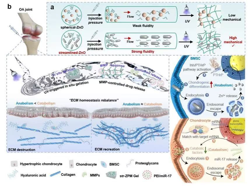 该研究聚焦于骨关节炎治疗中细胞外基质稳态失调这一关键问题,设计了一种具有基质金属蛋白酶响应特性的流线型氧化锌可注射水凝胶,并搭载miR-17-5p基因药物,实现细胞外基质稳态的双向调控。“与传统球形结构相比,流线型氧化锌结构优化了水凝胶的流变学和力学性能,赋予水凝胶高储能模量和低流动粘度的协同优势。”李楠介绍。
