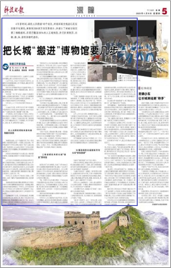 4年多时间,研究人员跨越10个省区,对明长城全线进行无盲区数字化测绘,采集到200多万张实景图片,并建立了长城全线实景三维数据库,目前已覆盖90%的人工墙体段,并已扩展到汉、北朝、唐、宋、清等多朝代遗存。