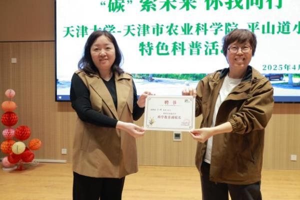 讲座后,平山道小学彭亚明副校长为宋院长与天津市农业科学院李妍研究员颁发平山道小学“科技副校长”聘书,旨在进一步加强高校、科研院所与中小学之间的教育资源共享,推动科教融合发展。