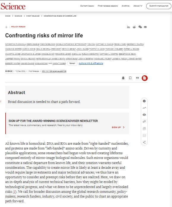 该国际专家团队呼吁对镜像细菌的研究进行进一步审查,呼吁科学家、政策制定者和广泛的其他利益相关者进行广泛对话,以规划一条更好地理解和减轻镜像细菌潜在风险的道路。值得注意的是,该团队内几位作者以前将创造镜像细菌视为长期的理想目标,如今对镜像细菌研究有了新的审视。