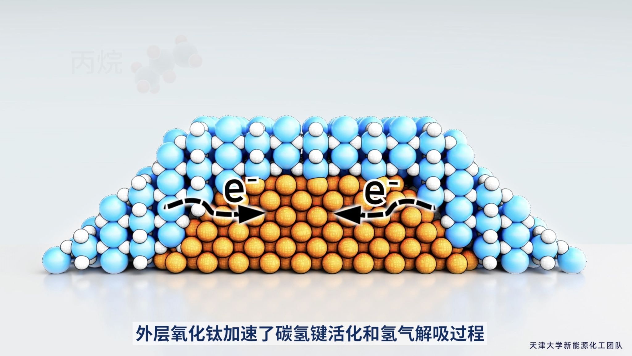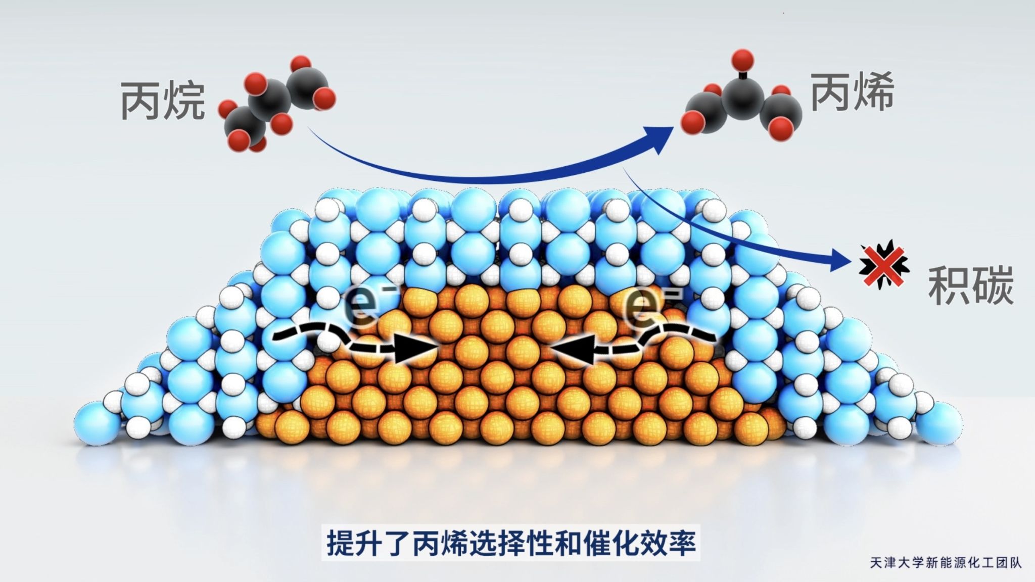 天津大学新能源化工团队在团队负责人巩金龙教授带领下,围绕“双碳”战略,以化工产业绿色低碳转型升级为目标,针对当前传统丙烷脱氢催化剂往往使用贵金属或高毒性元素现状,大胆提出了使用价格低廉且对环境友好的氧化物与金属产生电子作用从而促进催化过程的科学假设。团队根据这一思路,历时五年研发出氧化钛-镍复合催化剂。钛在地球上储量丰富,比常见的铜、锡、铅、锌都要多,我国是储量居世界前列的钛资源大国,全球镍资源也十分丰富。团队通过控制氧化钛在金属镍颗粒表面的覆盖程度,实现了氧化钛和镍之间电子转移的精准调节,在提升催化活性同时,抑制了裂解、积碳等副反应的发生。实验结果显示,这种新型催化剂体现出优异的丙烯选择性及稳定性,性能优于国际同类产品,可节约成本30%至50%,且同时实现了催化剂制备、使用过程的无毒化和低能耗,为发展下一代高效、廉价、环保可持续的丙烯催化剂奠定了科学基础。