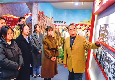 昨日上午,一场以“弘扬爱国传统 谱写时代华章”为主题的纪念“一二·九”运动89周年座谈活动在西青区李七庄街王兰庄村的天津“一二·九”抗日救亡运动纪念馆举行。图为“一二·九”运动亲历者方纪之子方兆麟为参观的大学生们讲解相关史实资料。