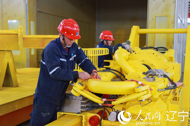 盘锦辽河油田天意石油装备有限公司的顶驱装配车间里,工人进行设备调试。人民网 邱宇哲摄