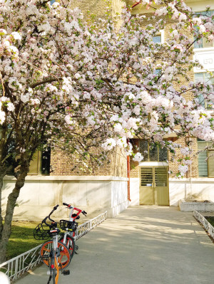 说明:天大体育馆前,春花怒放。花丛之中,几位舞者跟随教练训练,一招一式,灿然生趣,一幅花中舞图。