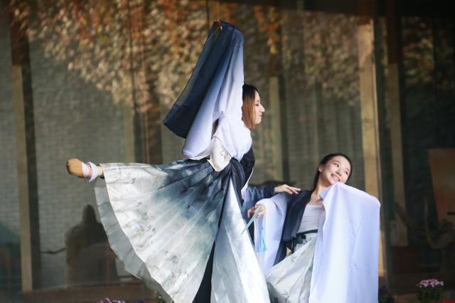 天津大学学生表演古典舞《湘君湘夫人图》。