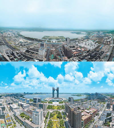 图为空中俯瞰上海市临港新片区滴水湖附近5年的变化(上图为2019年6月28日摄,下图为2024年8月14日摄)。