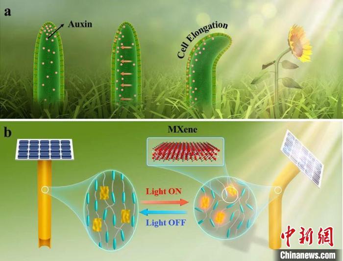 中新网天津4月20日电 (孙玲玲 通讯员 焦德芳)作为向光性植物的典型代表,向日葵不仅可以感知阳光的方向并随之响应,而且可以自发不断地紧紧追踪阳光运动,表现出了一种自我调节的生物智能。日前,天津大学封伟教授团队受自然界向日葵向光特性启发,成功开发了一种能“追光”的智能新材料——基于MXene增强液晶弹性体的仿生向日葵管状液晶驱动器。相关成果已发表于国际权威期刊《先进功能材料》。