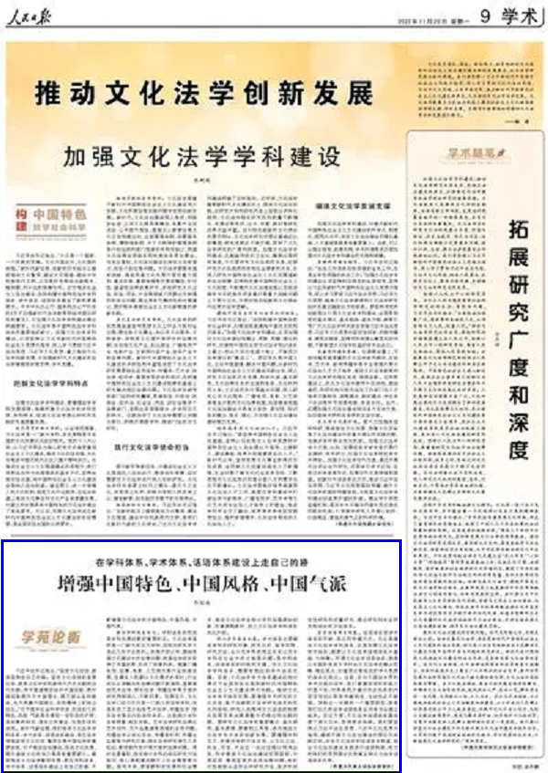 夯实话语体系根基。话语体系是学术体系的反映、表达和传播方式。无论是建设文化法学学科体系,还是发展文化法学学术体系,都要以文化法学话语体系为基础、为保障。所谓文化法学话语体系,就是以本国的语言文字对由文化法学的概念范畴、理论观点、价值观念等组成的学术思想的体系化表达。当前,在与外国法学界的学术交流对话中,我们掌握话语权的能力仍显不足,对具有西方意识形态色彩的内容自觉加以抵制的敏锐性、主动性还不够强。导致这一问题的一个重要原因,就是我们自己的法学话语体系还没有完全建立起来。在这方面,文化法学话语体系建设要下更大功夫,取得更多突破。我们要坚持以习近平法治思想、习近平文化思想为指导,继续开辟文化法治建设的理论与实践空间,夯实文化法学的话语体系根基,结合文化法治建设实践进行话语构建,努力把我们的思想理论优势真正转化为法学话语体系优势。(作者 天津大学法学院院长)