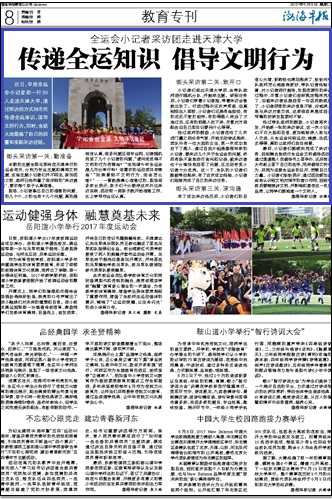 近日,早报全运会小记者团一行30人走进天津大学,通过街访的方式向市民传递全运知识、倡导文明行为,同时,也极大地锻炼了自己的胆量和实际采访经验。