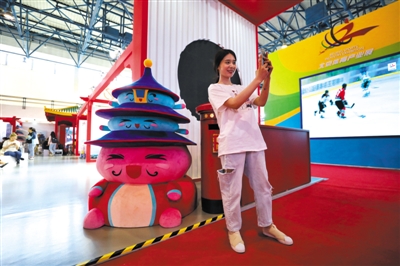 昨日,北京中国国际展览中心(老馆)第十四届北京文博会现场,“来自公园的礼物”展区门前摆放着大福神,参观市民与大福神拍照合影留念。