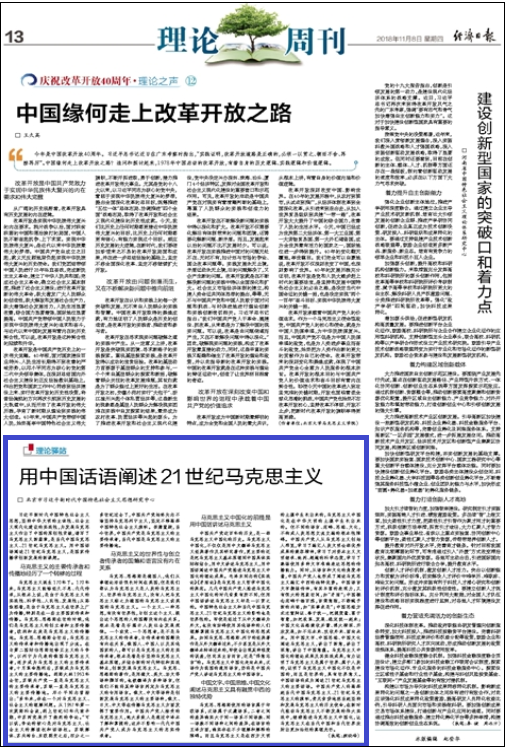本报讯(执笔 颜晓峰)习近平新时代中国特色社会主义思想,坚持中华文明的主体性、社会主义现代化建设的实践性,为发展马克思主义作出了中国的原创性贡献,谱写了马克思主义新篇章,是当代中国马克思主义、21世纪马克思主义。用中国话语阐述21世纪马克思主义,是国家传播学创新发展的新课题。