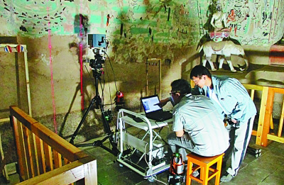 天津大学文化遗产保护与传承信息技术研究中心科研人员用自己研发的微变监测系统在莫高窟开展病害微变监测(天津大学供图)