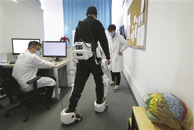 团队自主研发的世界首款神经调控式机械外骨骼“神工·神甲”机器人系统,可通过患者大脑想象运动场景,