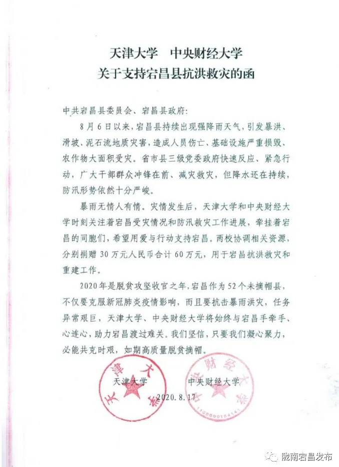 灾害无情人有情。天津大学和中央财经大学作为宕昌县对口帮扶单位,灾情发生后,两所学校时刻关注着宕昌受灾情况和防汛救灾工作进展。8月17日,经两校协调相关资源,分别捐赠30万元人民币合计60万元,用于宕昌抗洪救灾和重建工作。