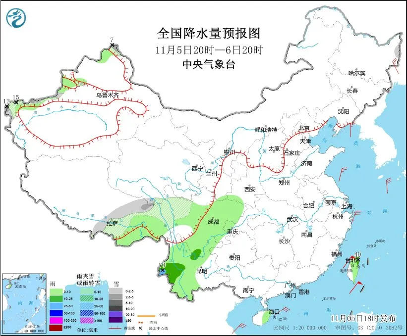 5日20时至6日20时,新疆北部和南疆西部山区、西藏中东部、川西高原北部等地部分地区有小到中雪或雨夹雪,其中,新疆北部高海拔山区和南疆西部山区等地局地有大到暴雪。四川南部、云南西南部和台湾岛东北部等地部分地区有中到大雨,其中,云南西南部局地有暴雨。