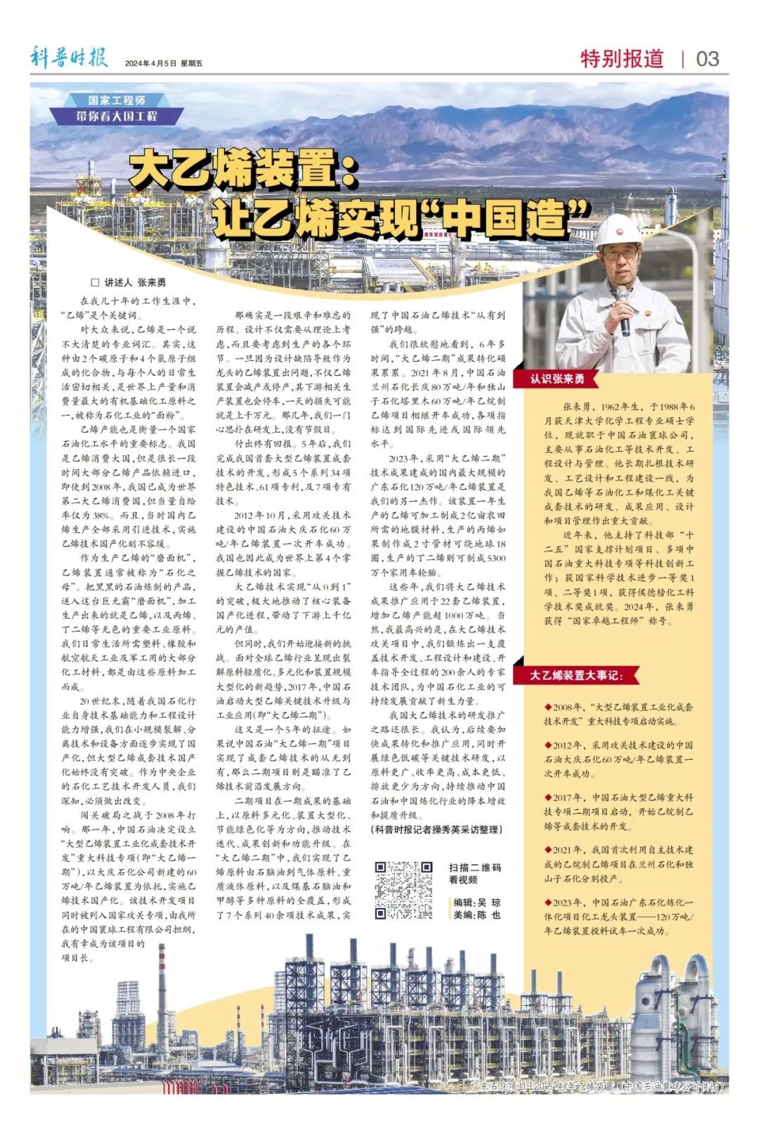 2023年,采用“大乙烯二期”技术成果建成的国内最大规模的广东石化120万吨/年乙烯装置是我们的另一杰作。该装置一年生产的乙烯可加工制成2亿亩农田所需的地膜材料,生产的丙烯如果制作成2寸管材可绕地球18圈,生产的丁二烯则可制成5300万个家用车轮胎。
