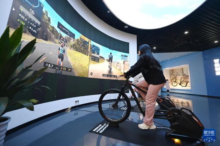 参观者在天津飞鸽品牌文化馆内体验飞鸽自行车(12月13日摄)。新华社记者 赵子硕 摄