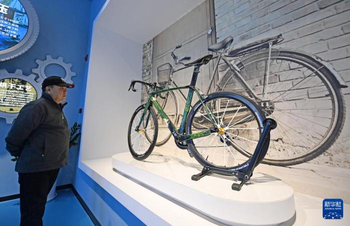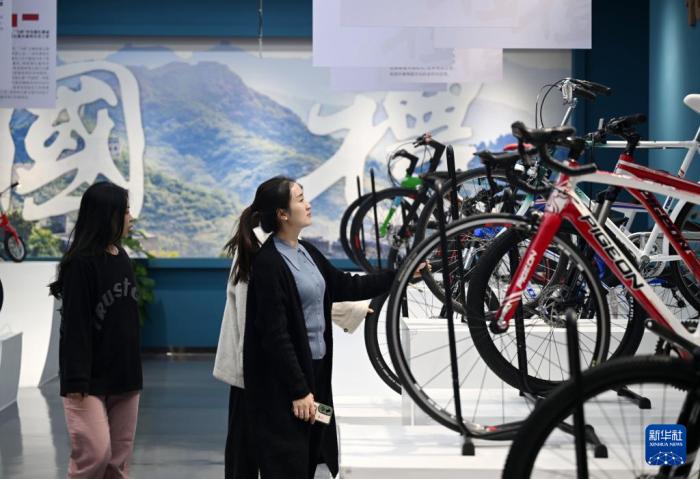 参观者在天津飞鸽品牌文化馆内了解飞鸽“国礼”系列自行车(12月13日摄)。新华社记者 赵子硕 摄