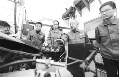 天津大学内燃机燃烧学国家重点实验室姚春德教授(右二)深入企业一线,对工程技术人员提供现场技改指导。