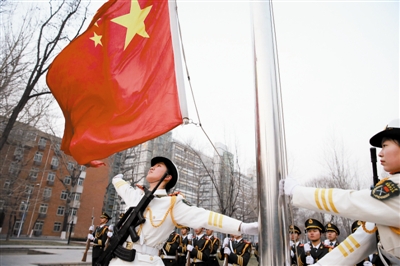 今晨7时,天津大学国旗护卫队员昂首挺胸,正步铿锵,走上北洋广场中央,在雄壮的国歌声中,升起新年第一旗。