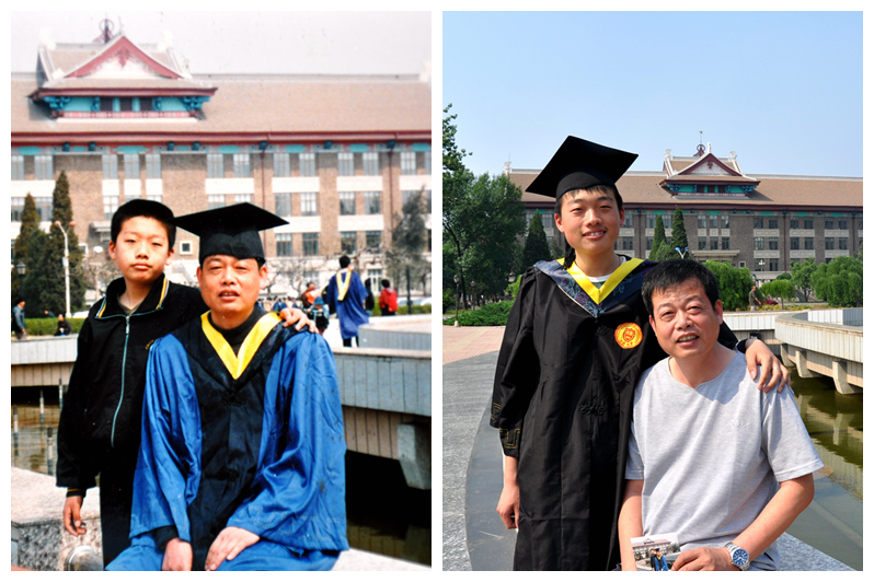 时隔13年,柴澍靖与父亲再次在天津大学第九教学楼前合影(右图)。天津大学供图