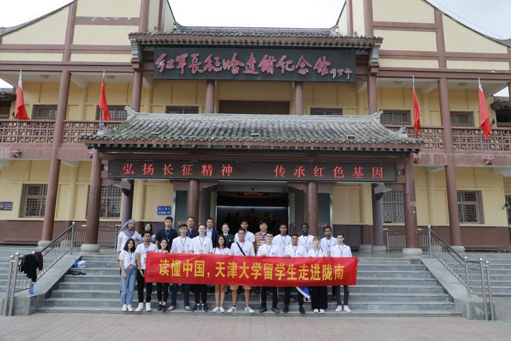 留学生在位于甘肃省陇南市宕昌县的红军长征哈达铺纪念馆前合影留念。新华社发 宋瑞 通联