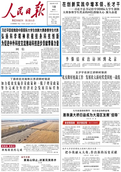 新华社北京10月17日电 近日,中共中央总书记、国家主席、中央军委主席习近平给中国国际大学生创新大赛参赛学生代表回信,对他们予以亲切勉励并提出殷切希望。