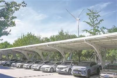 园区。图为园区内配有光伏设备的停车区,远处是风力发电设备。
