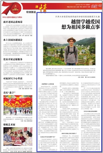 城市快报讯(记者 侯砚)“留学期间,我们虽生活在另外一个文化体系里,骨子里却烙着中华文化的印记。”天津大学表层地球系统科学研究院副教授、博士后王礼春说,出国留学其实是站在离祖国很远的地方看着她,更希望她强大而美好。因此,很多留学生有过这样一段经历后,才真正体会到“祖国”对于自己而言意味着什么。