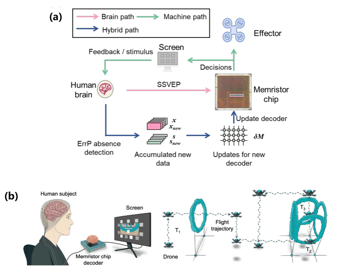 a图为脑-忆阻器交互式更新框架,b图为基于忆阻器脑电解码的实时脑控无人机飞行(央广网发 天津大学供图)