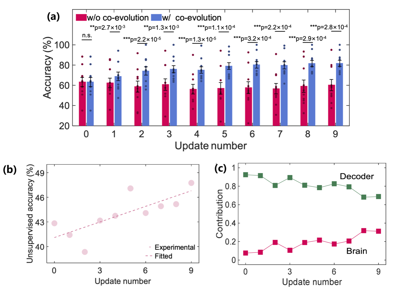 a图为协同演进脑机解码正确率较初始状态提高20%,b图为任务相关脑电特征发生正向演化,c图为脑与忆阻器解码器实现互适应(央广网发 天津大学供图)