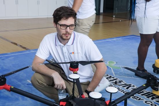 来自青岛大学国际教育学院的俄罗斯留学生尤里正在观察水下无人机的构造。青岛大学 丁小雨/摄