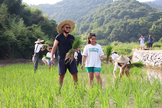 近日,由宁波大学商学院20名中外学生组成的“插秧小分队”在宁波市奉化区裘村镇助力当地农户“双抢”农忙。来自摩洛哥的留学生穆罕默德和赛尔玛正在学习插秧。宁波大学 张若昊/摄