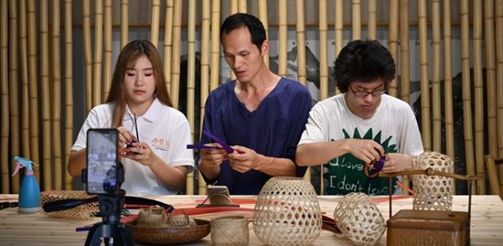 来自缅甸的浙江传媒学院留学生周让(左)正在学习中国传统手工艺竹编,并通过网络直播的方式向观众介绍竹编艺术。浙江传媒学院供图