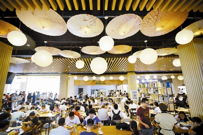 “在新中式风格里加入了很多文艺元素,尽量选择淡色系与原木色,使用暖光源,让每个离家的学子都有一种家的温暖和亲切的感觉。”食堂设计者告诉记者。图为改造升级后的天津大学学五食堂。