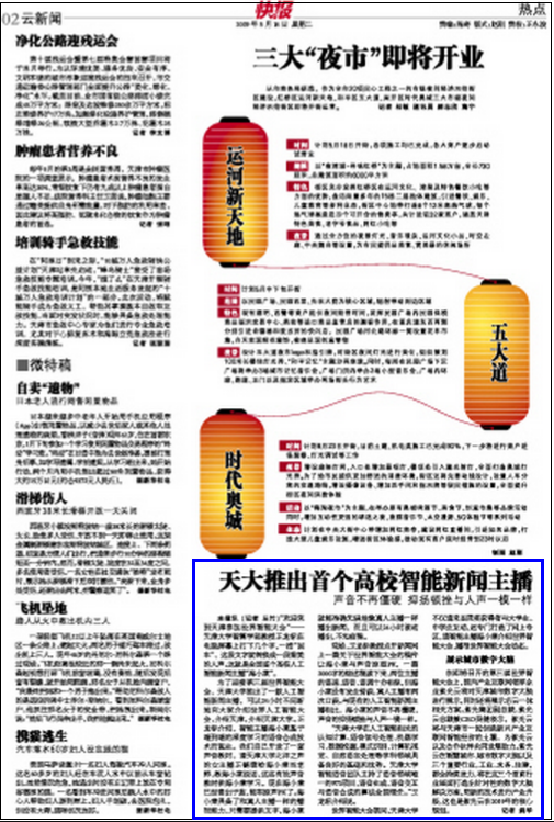 为了迎接第三届世界智能大会,天津大学推出了一款人工智能新闻主播,可以24小时不间断地向大家介绍世界人工智能大会,介绍天津,介绍天津大学。王龙标介绍,智能主播海小棠基于端到端的深度学习的语音合成技术而诞生。我们自己开发了一套声音教材,请天津大学北洋之声的女主播王鹤蓉给海小棠当老师,教海小棠说话,这些有效声音教材供海小棠学习。现在海小棠已经青出于蓝,能和原声PK了。海小棠具备了和真人主播一样的播报能力,只需要提供文字,海小棠就能准确无误地像真人主播一样播出新闻,而且可以24小时滚动播出,不知疲倦。
