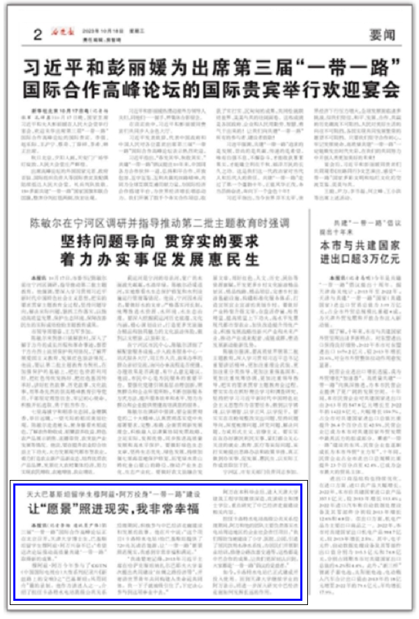 本报讯(记者李杨 通讯员尹伟)第三届“一带一路”国际合作高峰论坛正在北京召开,天津大学博士生、巴基斯坦留学生穆阿兹·阿万兴奋不已:“希望这次论坛推动高质量共建‘一带一路’取得新的成果。”
