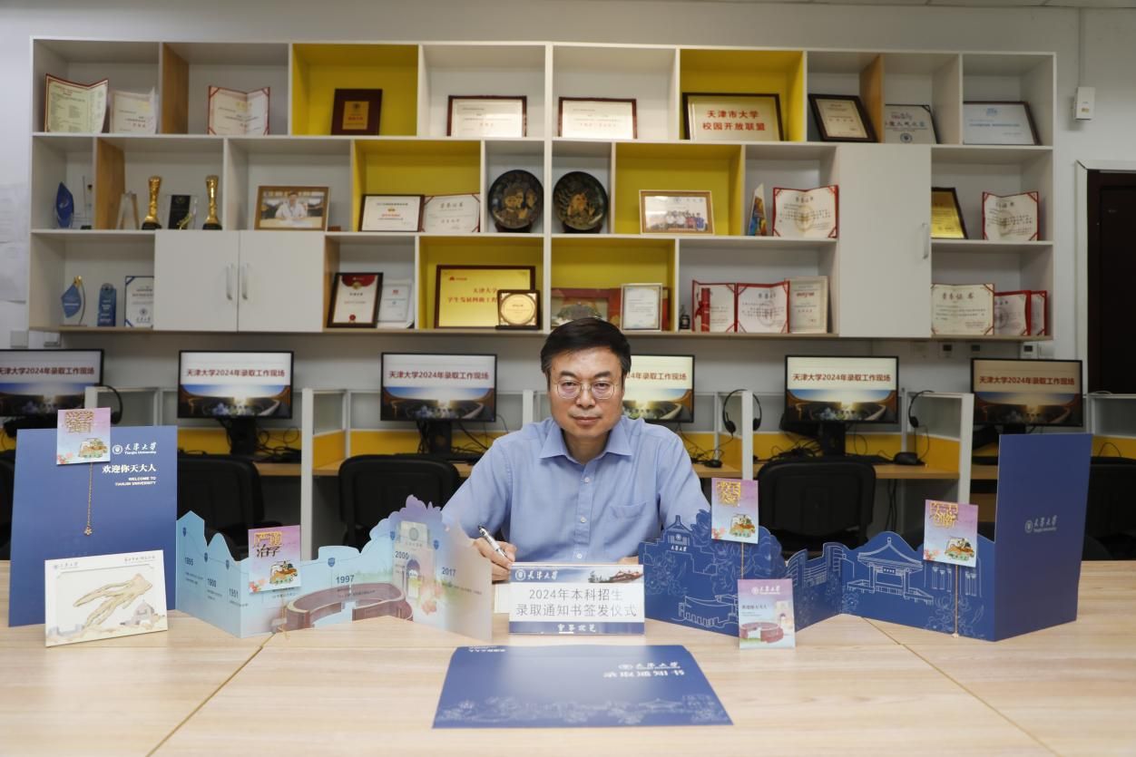7月14日,伴随着许建勇校友的祝贺,承载着天大精神的第一份通知书由天大校友们转交到浙江省宁波市镇海中学的周紫檀同学手中。该封编号为“0001”的本科生录取通知书,由天津大学校长金东寒在7月12日签发。
