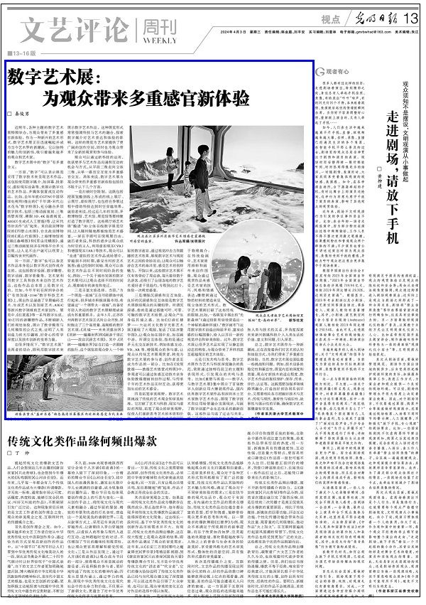 总之,数字艺术展作为一种新潮流,正在改变着我们对艺术的认知和体验方式,为我们带来了多重感官新体验。当然,数字艺术展也面临着一些挑战和问题。例如,技术设备的稳定性和兼容性,展览内容的深度和质量,观众对新技术的适应程度,数字艺术作品的版权保护、保存、传承、评价、认证等。这既需要加强多领域跨界融合,打造良好的协同共创平台,又需要相关各方把握好技术与艺术、传统与现代、教育性与娱乐性、故事性与展示性的平衡,确保数字艺术展健康有序发展。