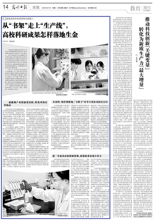 3月5日,习近平总书记在参加十四届全国人大二次会议江苏代表团审议时强调,用新技术改造提升传统产业,积极促进产业高端化、智能化、绿色化。在“双碳”目标引领下,我国绿色低碳产业高速发展,成为全球绿色低碳技术创新的重要贡献力量。高校“双碳”新能源技术成果如何转化为推动产业升级的“绿色生产力”?从能源开发到运输、存储,高校科研成果上“生产线”,能否一路畅通?记者进行了采访。